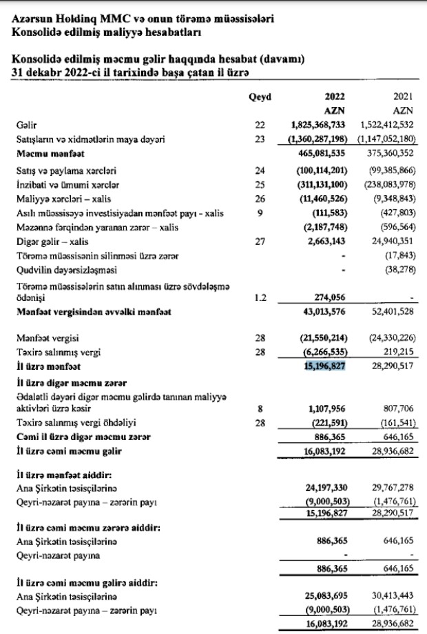 Azərbaycanda iri qida məhsulları istehsalçısı"Azərsun Holdinq" MMC 2022-ci ili 15 miylon 961 min manat xalis mənfəət ilə başa vurub. Holdinq 2021-ci ili 28 milyon 291 min manat xalis mənfəət ilə bağlamışdı.