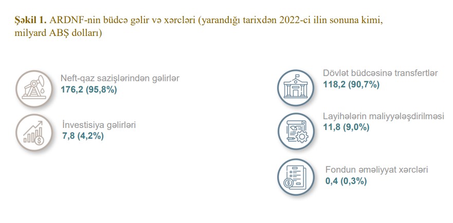Yarandığı tarixdən 2022-ci ilin sonuna kimi ARDNF dövlət büdcəsinə 118,2 milyard dollar (200,94 milyard manat) transfert edib, layihələrin maliyyələşdirilməsinə 11,8 milyard dollar (20,06 milyard manat), Fondun saxlanılmasına 0,4 milyard dollar (0,68 milyard manat) xərcləyib.