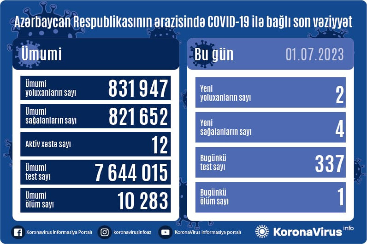 Azərbaycanda indiyədək ümumilikdə 831 947 nəfər koronavirus infeksiyasına yoluxub. Onlardan 821 652 nəfər müalicə olunaraq sağalıb, 10 283 nəfər vəfat edib, aktiv xəstə sayı 12 nəfərdir.