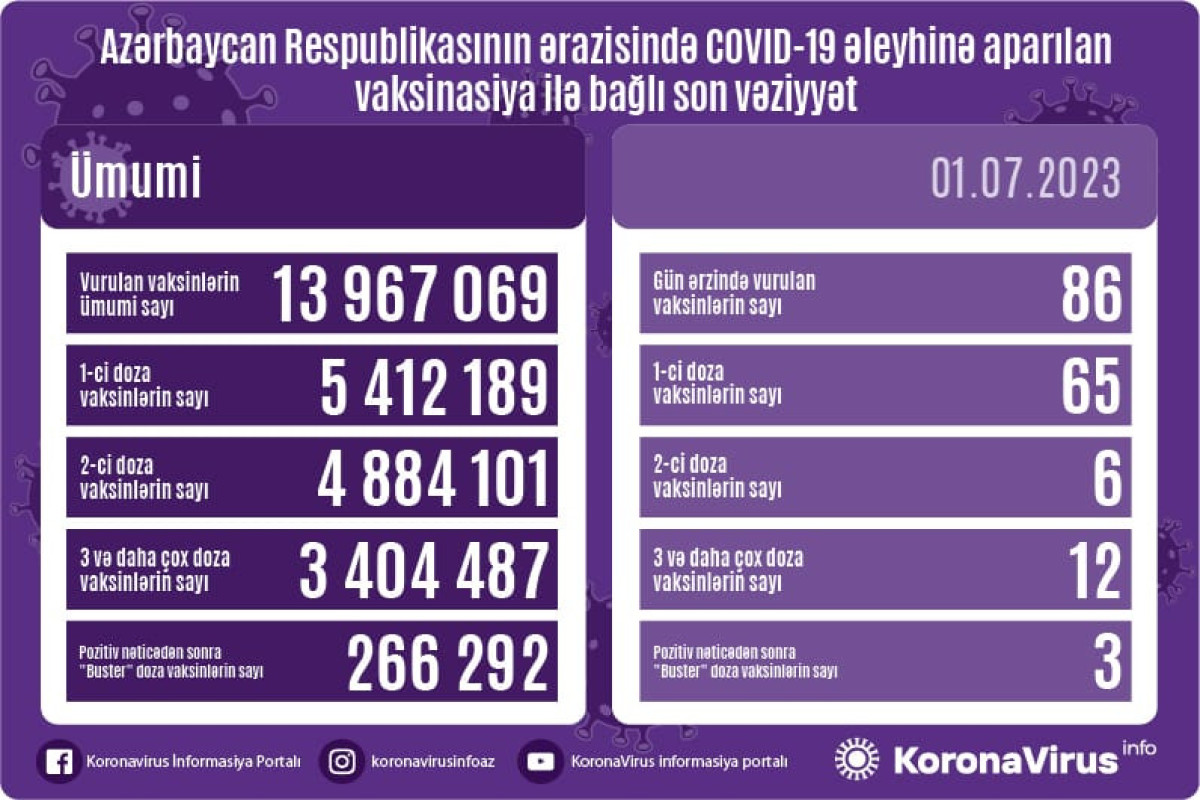 Azərbaycanda son sutkada koronavirus (COVID-19) əleyhinə 86 vaksin vurulub. Bir gündə birinci mərhələ üzrə vaksinasiya olunanların sayı 65, ikinci mərhələ üzrə vaksinasiya olunanların sayı 6, üç və daha çox doza vaksin vurduranların sayı 12, pozitiv nəticədən sonra buster doza üzrə vaksinasiya olunanların sayı isə 3 nəfərdir.
