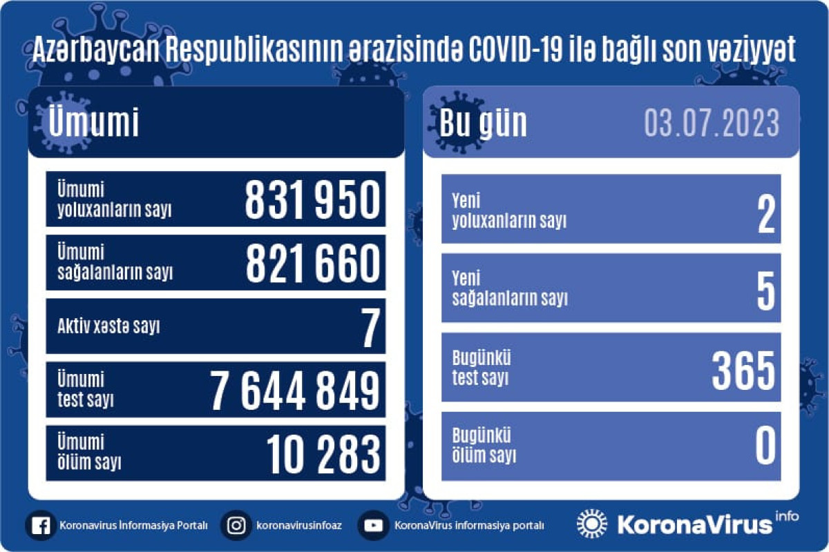Azərbaycanda koronavirus (COVID-19) infeksiyasına 2 yeni yoluxma faktı qeydə alınıb, 5 nəfər müalicə olunaraq sağalıb.