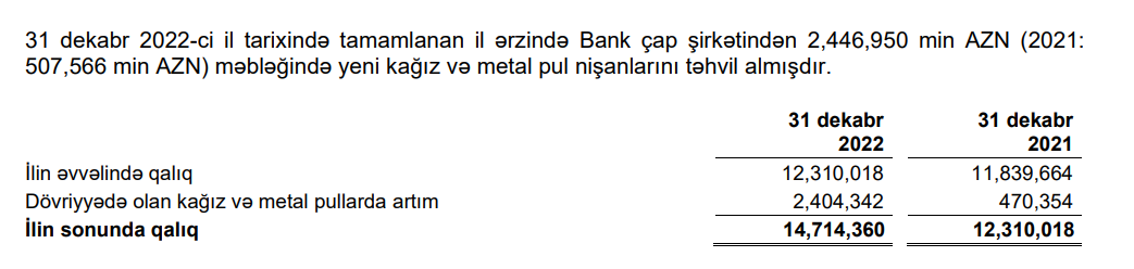 31 dekabr 2022-ci il tarixində tamamlanan il ərzində Mərkəzi Bank çap şirkətindən 2 milyard 446 milyon 950 min manat məbləğində yeni kağız və metal pul nişanlarını təhvil alıb.