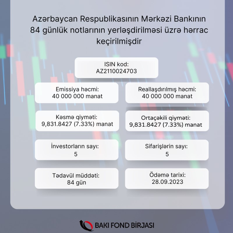 6 iyul 2023-cü il tarixində Bakı Fond Birjasında Azərbaycan Respublikasının Mərkəzi Bankının (ARMB) AZ2110024703 dövlət qeydiyyat nömrəli 40 milyon manat həcmində 84 gün tədavül müddətli notlarının yerləşdirilməsi üzrə hərrac keçirilmişdir.