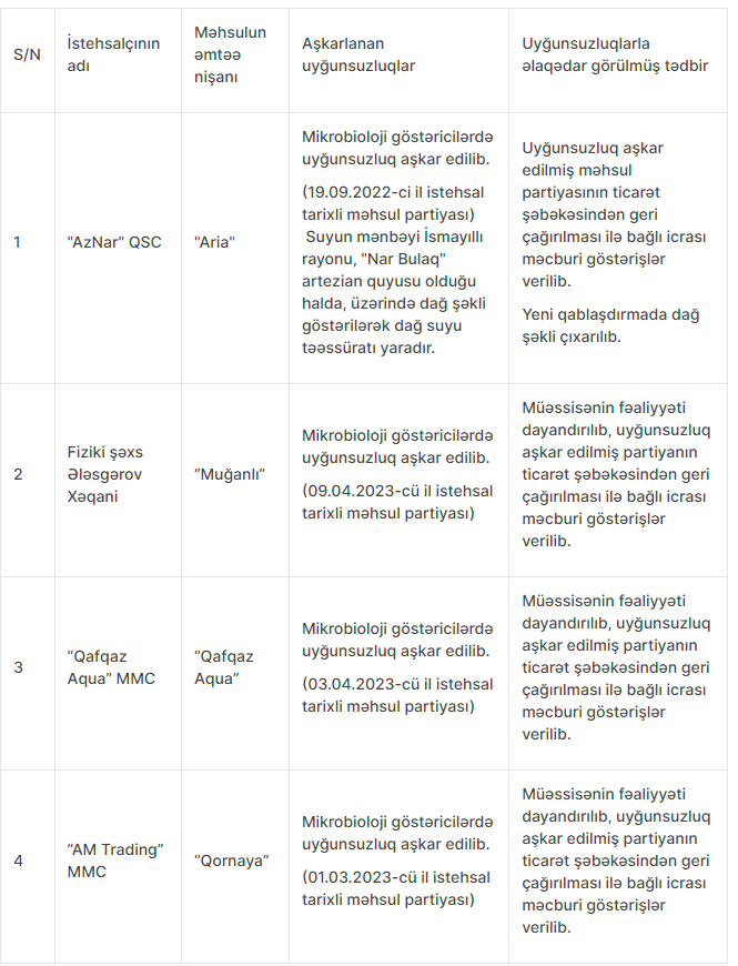3 | “Qafqaz Aqua” MMC | “Qafqaz Aqua” | Mikrobioloji göstəricilərdə uyğunsuzluq aşkar edilib. (03.04.2023-cü il istehsal tarixli məhsul partiyası) | Müəssisənin fəaliyyəti dayandırılıb, uyğunsuzluq aşkar edilmiş partiyanın ticarət şəbəkəsindən geri çağırılması ilə bağlı icrası məcburi göstərişlər verilib. |