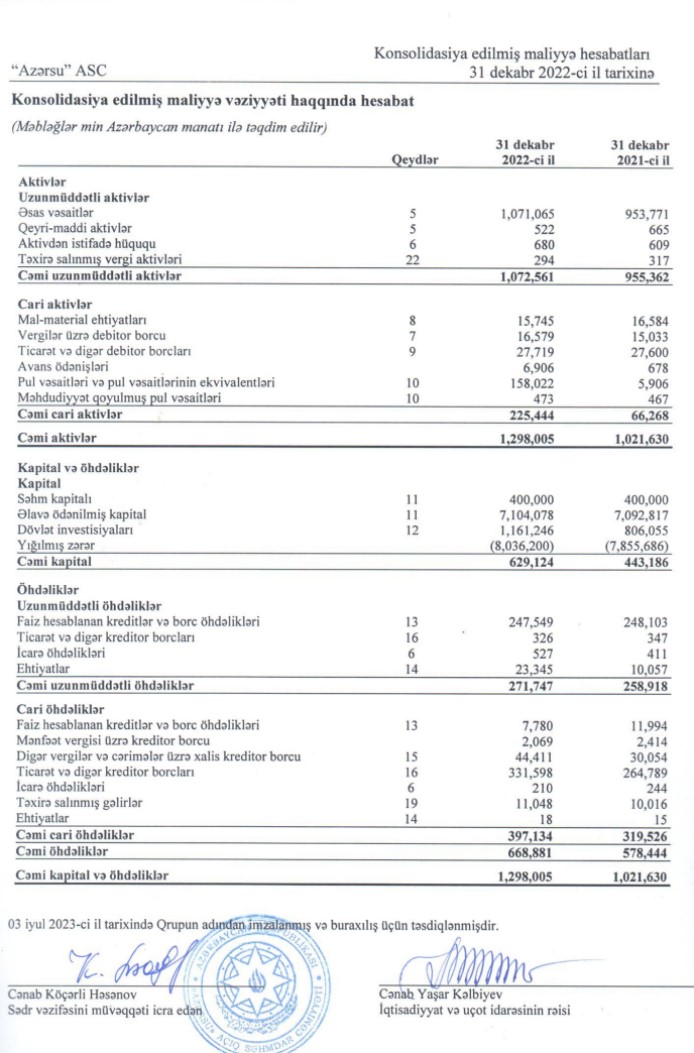 “Azərsu” ASC 31 dekabr 2022-ci il tarixində 1 milyard 298 milyon 5 min manat cəmi aktivlərə malik olub. Şirkət 2021-ci ilin sonunda 1 milyard 21 milyon 630 min manat cəmi aktivlərə malik idi.