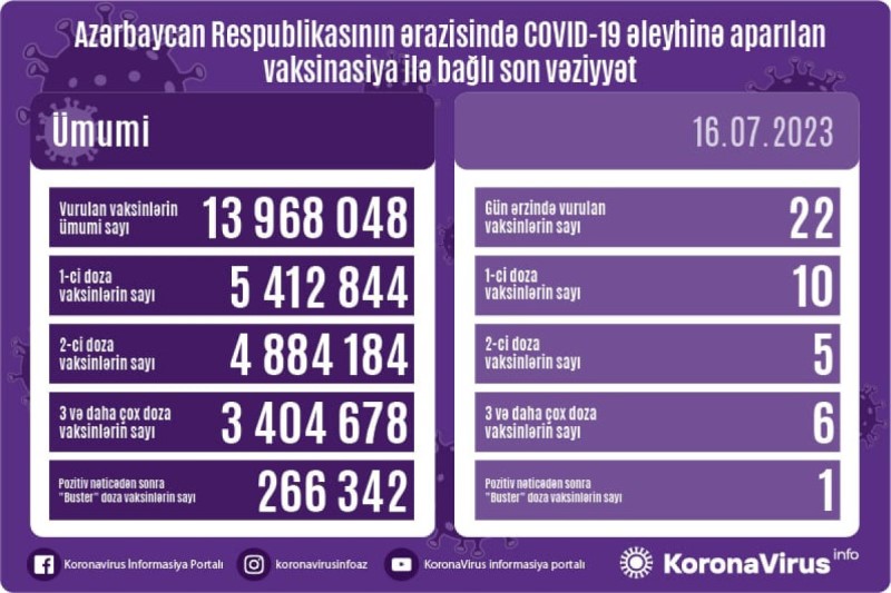 Azərbaycanda son sutkada koronavirus (COVID-19) əleyhinə 22 vaksin vurulub. Bir gündə birinci mərhələ üzrə vaksinasiya olunanların sayı 10, ikinci mərhələ üzrə vaksinasiya olunanların sayı 5, 3-cü və daha çox doza üzrə vaksinasiya olunanların sayı 6, pozitiv nəticədən sonra buster doza olunanların sayı isə 1 nəfərdir.