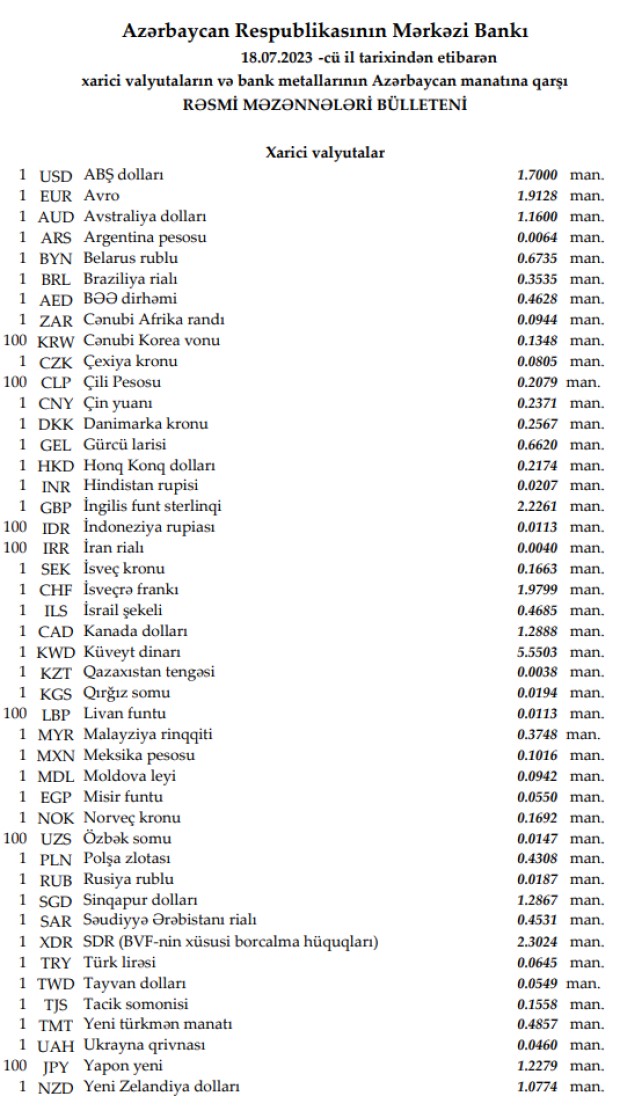 Dolların bazar ertəsi üçün rəsmi məzənnəsi müəyyən olunub