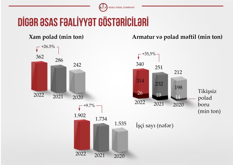 Xam polad istehsalı – pəstah 26,5%, armatur və polad məftil istehsalı isə 35,5% artıb. Boru istehsalı üzrə artım daha çox – 36,8%-ə bərabərdir. Şirkət tərəfindən 2022-ci ildə 362 min ton pəstah, 314 min ton armatur və polad məftil, 26 min ton boru istehsal edilib.