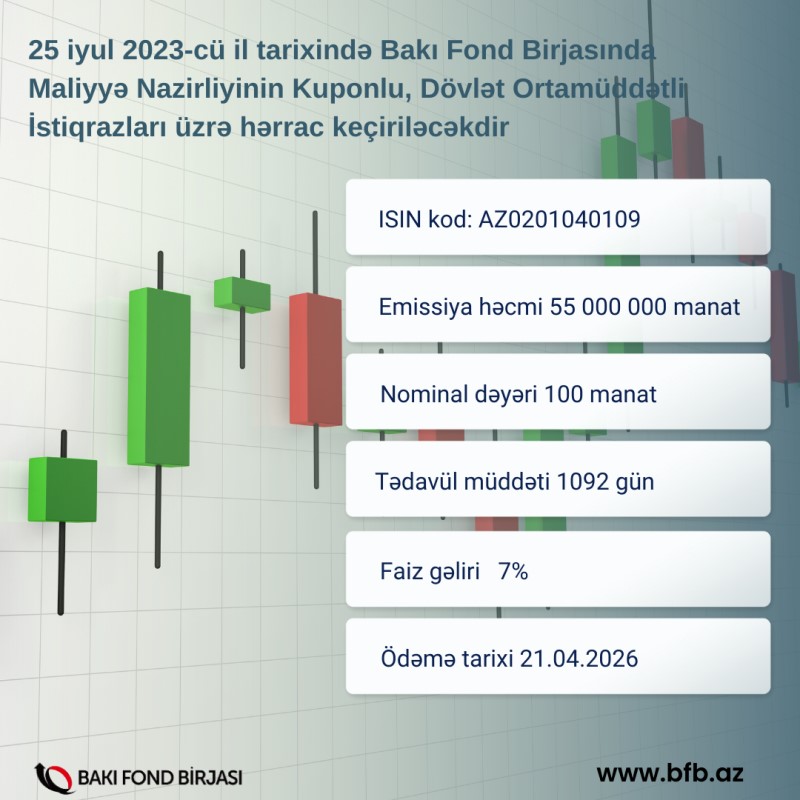 25 iyul 2023-cü il tarixində Bakı Fond Birjasında Maliyyə Nazirliyinin Kuponlu, Dövlət Ortamüddətli İstiqrazları (DOİ) üzrə hərrac keçiriləcəkdir.
