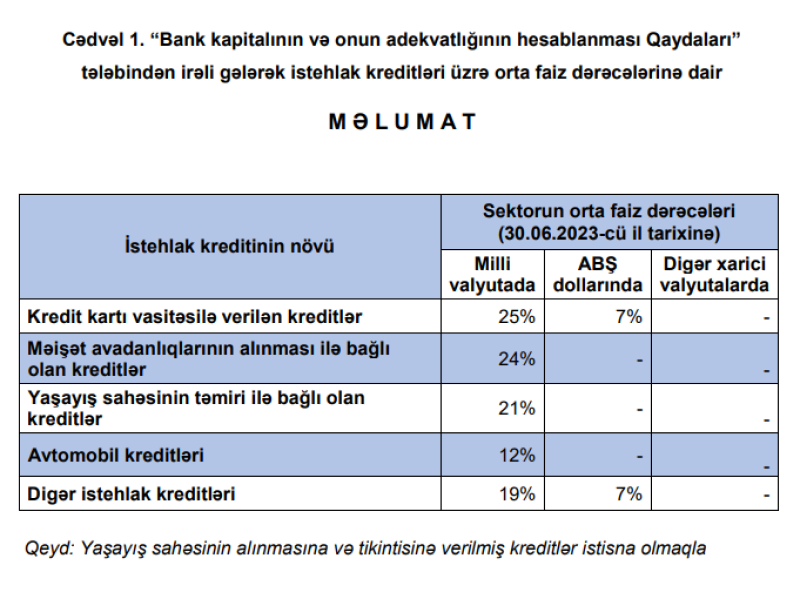 Ötən ilin sonunda, milli valyutada, orta faiz dərəcəsi - kredit kartı vasitəsilə verilən kreditlər üzrə 26%, məişət avadanlıqlarının alınması ilə bağlı olan kreditlər üzrə 23%, yaşayış sahəsinin təmiri ilə bağlı olan kreditlər üzrə 23%, avtomobil kreditləri üzrə 15% və digər istehlak kreditləri üzrə 19% təşkil etmişdi.