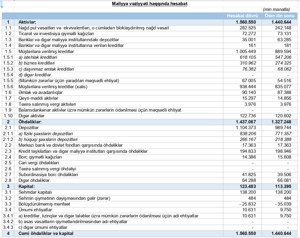 Daha bir bankın müştərilərə verdiyi kreditlər 1 milyard manatı keçib