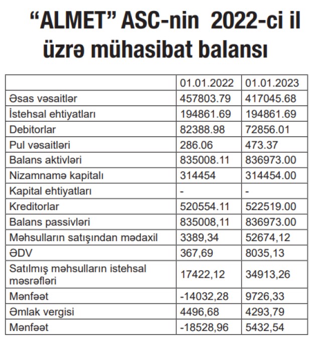 “ALMET” ASC 2022-ci ili 5 min 432 manat xalis mənfəət ilə başa vurub. ASC 2021-ci ili 18 min 528 manat xalis zərər ilə bağlamışdı.