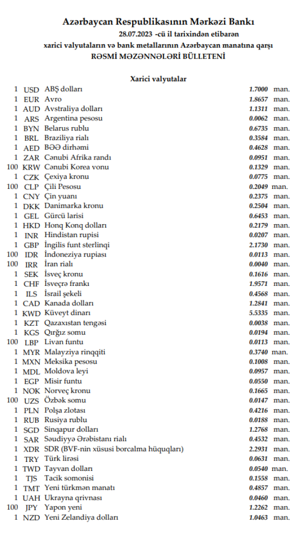 Dolların bazar ertəsi üçün rəsmi məzənnəsi müəyyən olunub