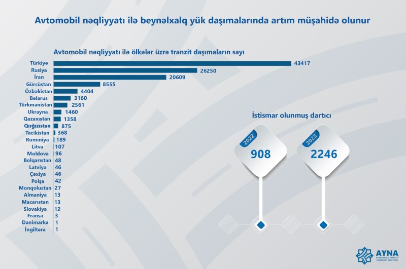 AYNA-nın yaydığı məlumatda bildirilir ki, 2022-ci ilin müvafiq dövrü ilə 2023-cü ilin yanvar-iyun aylarının göstəricilərinin müqayisəsi daşımalarda istifadə edilən nəqliyyat vasitələri parkının genişləndiyini, daşıyıcıların sayının, eləcə də Azərbaycan daşıyıcılarının bazar paylarının daha da artdığını göstərir.