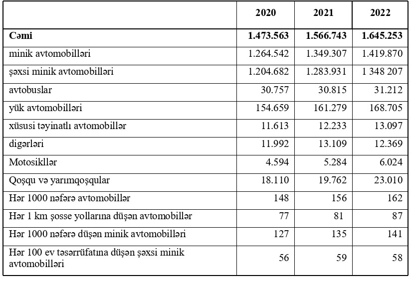 2022-ci ildə Azərbaycanda cəmi nəqliyyat vasitələrinin (minik və yük avtomobiləri, avtobuslar, motosikllar, xüsusi vasitələr) sayı 78 min 510 ədəd artaraq 1 milyon 645 min 253 ədədə yüksəlib.
