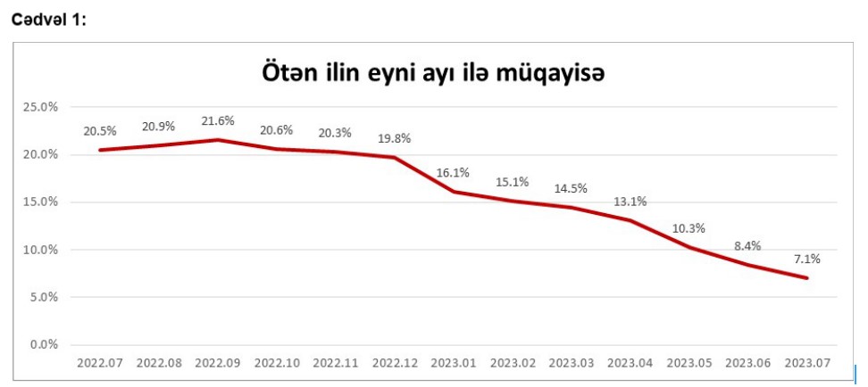 Belə ki, tez köhnələn qida məhsullarının qiymətində keçən ilin iyul ayına nisbətən 9.7% artım, quru, dondurulmuş qida məhsullarının, şirniyyat və spirtsiz içkilərin qiymətində 5.4% artım, spirtli içkilər və tütün məmulatlarının qiymətində 3.4%, gigiyena və təmizlik vasitələrinin qiymətində isə 8.1% artım izlənilib.