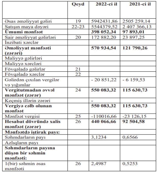 Marja.az xəbər verir ki, 2021-ci ildə Şirkətin əsas əməliyyat gəlirləri (satış) 2 milyon 505 min 259 manat ikən, 2022-ci ildə 5 milyon 942 min 431 manata yüksəlib (2,4 dəfə artıb).