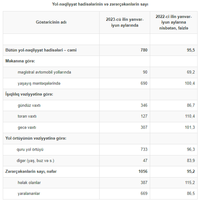 Marja.az xəbər verir ki, 2023-cü ilin yanvar-iyun aylarında 780 və ya 2022-ci ilin müvafiq dövrü ilə müqayisədə 4,5 faiz az yol-nəqliyyat hadisəsi baş vermiş, bu hadisələr nəticəsində zərər çəkən şəxslərin sayı 4,8 faiz azalaraq 1056 nəfər olmuşdur. Onlardan 387-si həlak olmuş, 669-u isə yaralanmışdır. Hadisələrin 44,3 faizi gündüz, 39,4 faizi gecə, 16,3 faizi isə toran vaxtı baş vermiş, 29,2 faizi həftənin şənbə və bazar günlərinə təsadüf etmişdir.