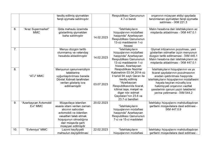 Antiinhisar və İstehlak Bazarına Nəzarət Dövlət Xidmətinin İstehlakçı hüquqlarının müdafiəsi və İstehlak bazarına nəzarət şöbələri tərəfindən 2023-cü ilin yanvar-iyul ayları ərzində tərtib olunmuş inzibati xəta haqqında protokollara dair məlumatlar açıqlanıb.