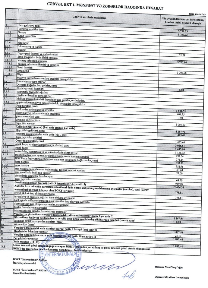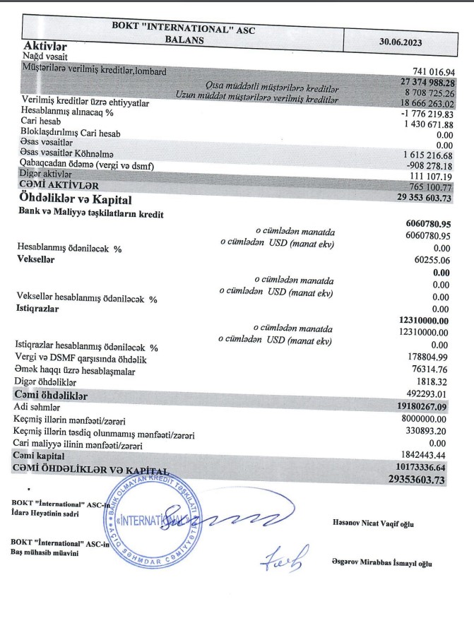 30 iyun 2022-ci il tarixində BOKT "İnternational"ın kredit portfeli (müştərilərə verilmiş kreditlər) 20 milyon 777 min manat ikən, 30 iyun 2023-cü il tarixində 27 milyon 375 min manata çatıb. Təşkilatın cəmi aktivləri isə 23 milyon 300 min manatdan 29 milyon 353 min manata yüksəlib.