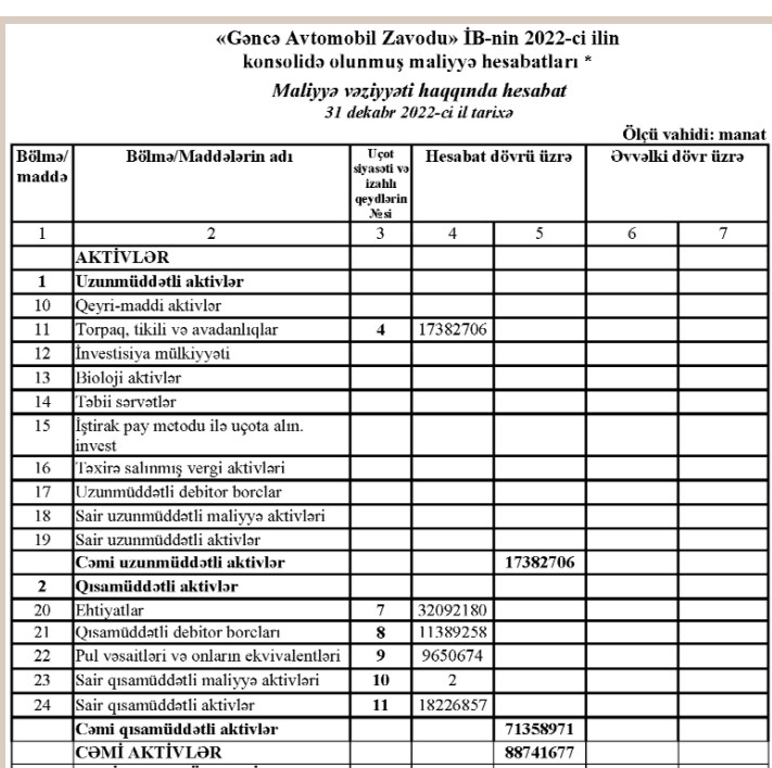 31 Dekabr 2022-ci il tarixində "Gəncə Avtomobil Zavodu" İB 88 milyon 742 min manat cəmi aktivlərə malik olub. Zavod 2021-ci ilin sonunda 97 milyon 722 min manat cəmi aktivlərə malik idi.