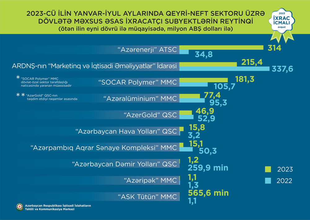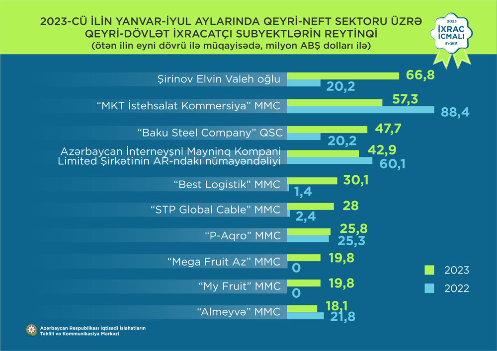 Şirinov Elvin Valeh oğlu 2023-cü ilin yanvar-iyul ayları üzrə qeyri-dövlət ixracatçı subyektlərin reytinqində 1-ci yeri tutub.