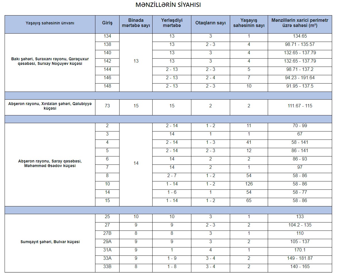 Qeyd edilib ki, daha 34 mənzil isə Bakı şəhəri, Suraxanı rayonu, Qaraçuxur qəsəbəsi, Surxay Noçuyev küçəsində yerləşən kompleksdə təqdim olunur. Yaşayış sahələri 2, 3 və 4 otaqlıdır.