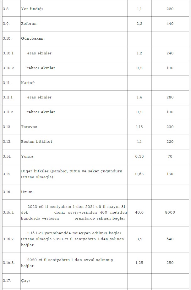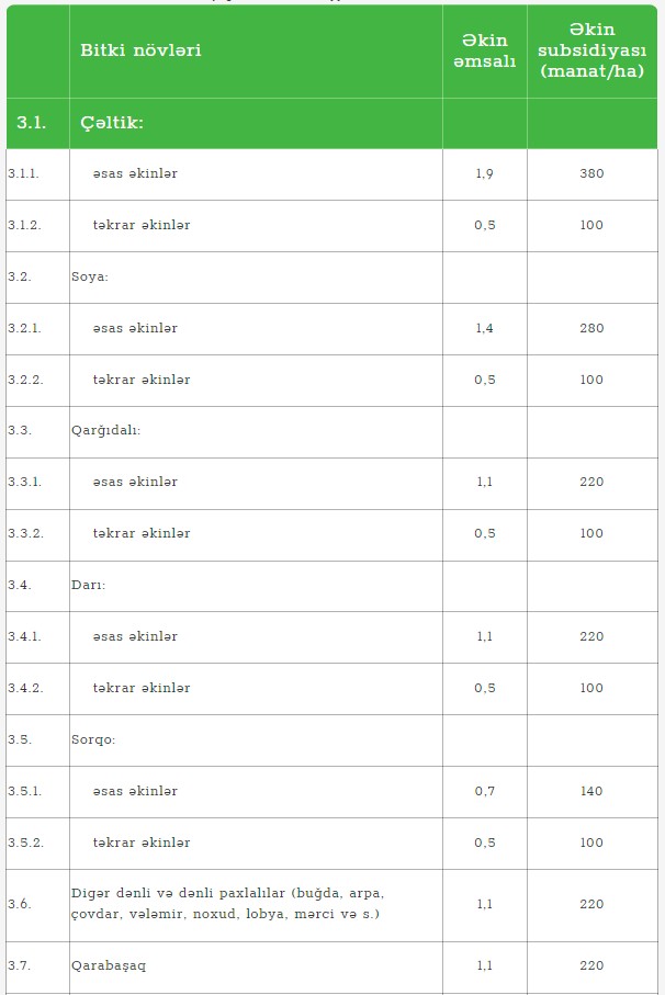 Qərara əsasən, baza məbləği 200 manat olmaqla 2024-cü ildə əkin əmsalları və əkin subsidiyasının məbləği kənd təsərrüfatı bitkiləri üzrə aşağıdakı kimi müəyyən olunub: