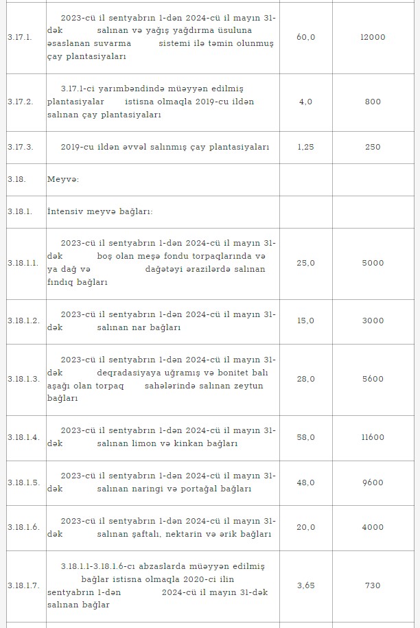 2023-cü il sentyabrın 1-dən 2024-cü il mayın 31-dək deqradasiyaya uğramış və bonitet balı aşağı olan torpaq sahələrində salınan intensiv zeytun bağlarının hər hektarına görə 5600 manat, boş olan Meşə Fondu torpaqlarında, dağlıq və dağətəyi ərazilərdə salınan intensiv fındıq bağlarının hər hektarına görə 5000 manat məbləğində əkin subsidiyası ödəniləcəkdir.