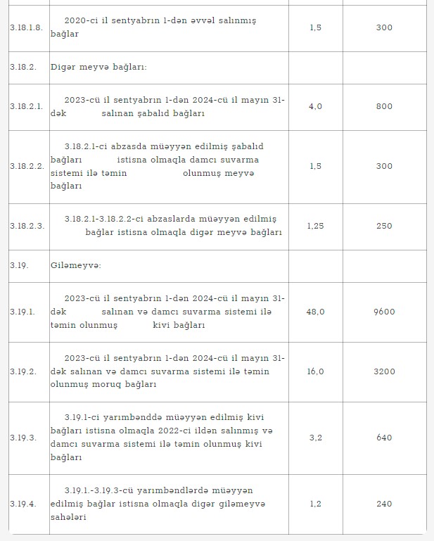 2024-cü ildə damcı suvarma sistemi ilə təmin olunmuş həm ənənəvi, həm də yaşı 4 ildən çox olan intensiv bağlara görə əkin subsidiyası 250 manatdan 300 manata qədər artırılmışdır.