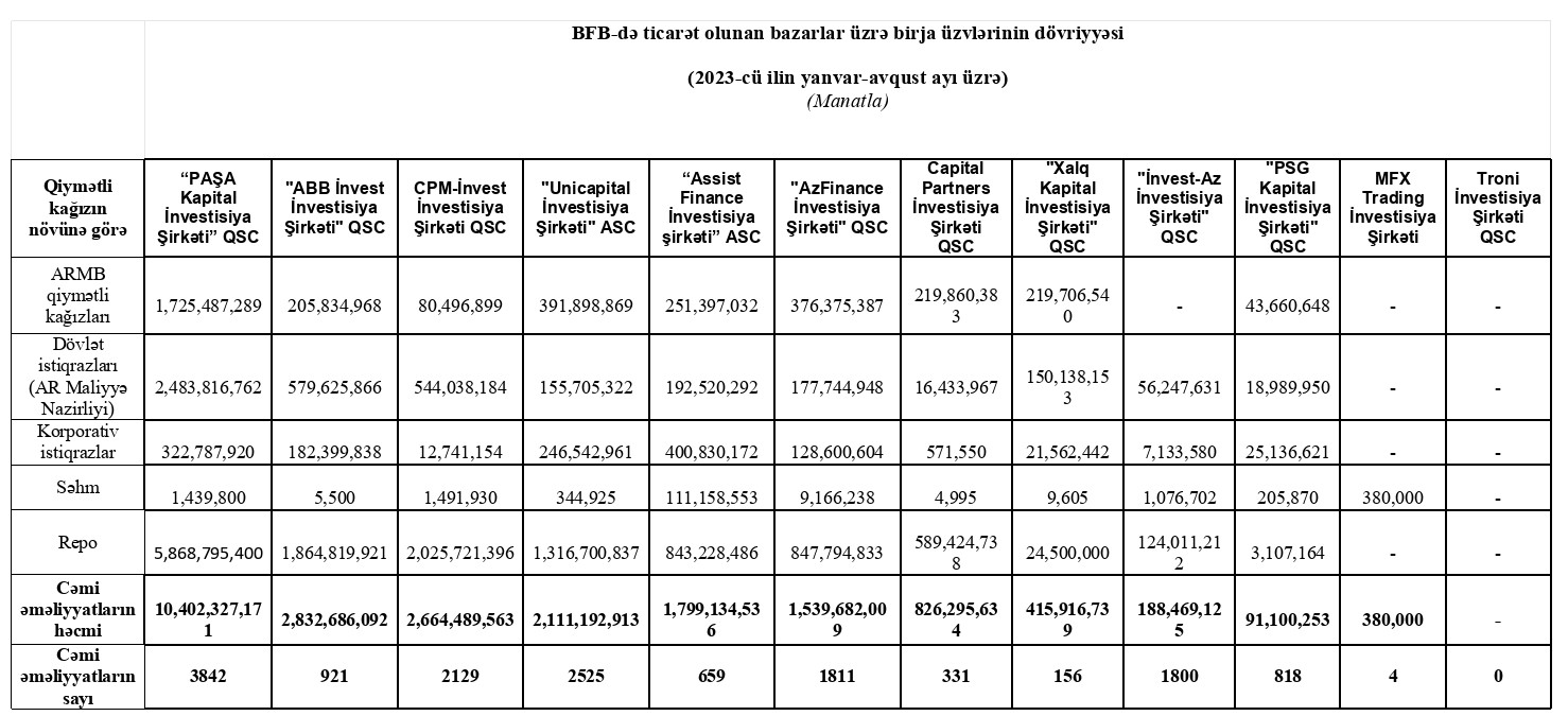 Marja.az Birja-ya istinadən xəbər verir ki, “PAŞA Kapital İnvestisiya Şirkəti” QSC 10 milyard 402 milyon 327 min mant dövriyyə ilə 1-ci, "ABB İnvest İnvestisiya Şirkəti" QSC 2 milyard 832 milyon 686 min manat dövriyyə ilə 2-ci, CPM-İnvest İnvestisiya Şirkəti QSC 2 milyard 664 milyon 489 min manat dövriyyə ilə 3-cü yeri tutub.