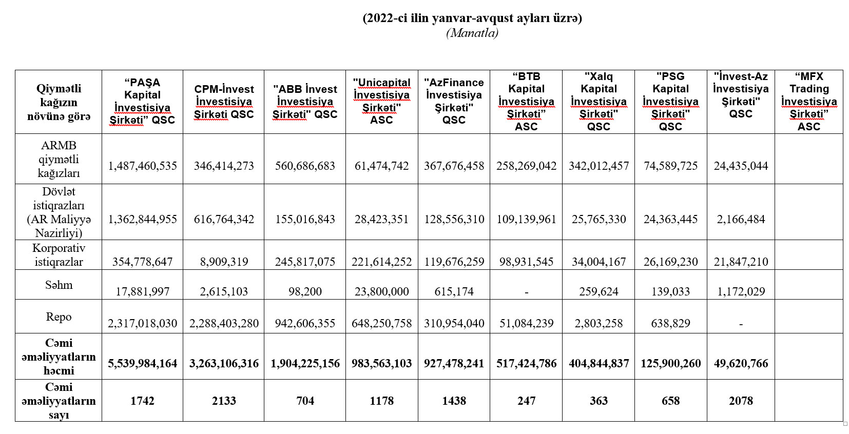 2022-ci ilin yanvar-avqust aylarında dövriyyənin həcminə görə “PAŞA Kapital İnvestisiya Şirkəti” 1-ci, “ CPM-İnvest İnvestisiya Şirkəti” 2-ci, "ABB İnvest İnvestisiya Şirkəti" 3-cü yeri tutmuşdu.
