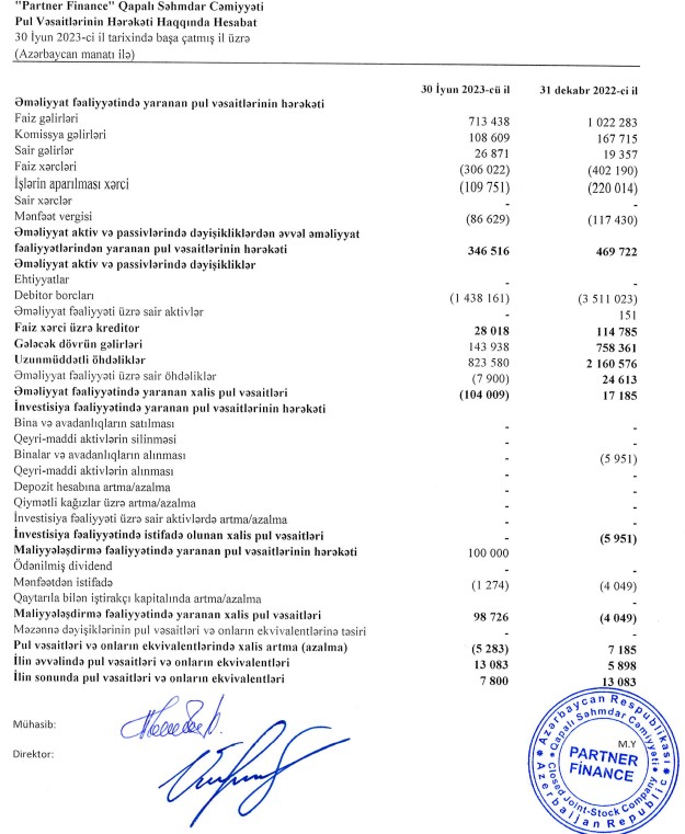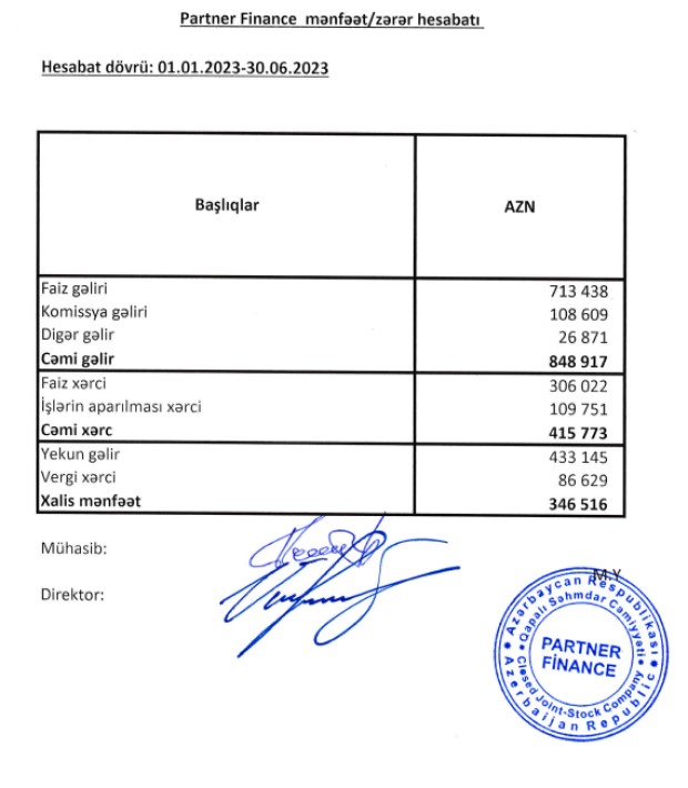 2023-cü ilin yanvar-iyun dövründə "Partner Finance"ın cəmi gəlirləri 848 min 917 manat, cəmi xərcləri 4L5 min 773 manat təşkil edib.
