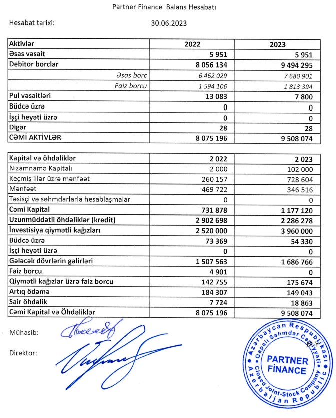 Ötən ilin sonunda "Partner Finance"ın lizinq portfeli (debitor borclar) 8 milyon 56 min 134 manat ikən, 30 iyun 2023-cü il tarixində 9 milyon 494 min 295 manata çatıb (1 milyon 438 min 161 manat artıb).
