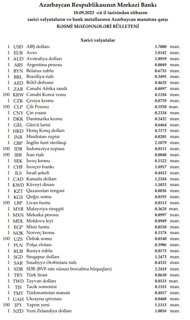 Dolların bazar ertəsi üçün rəsmi məzənnəsi müəyyən olunub