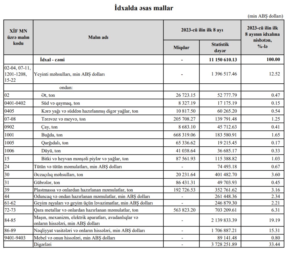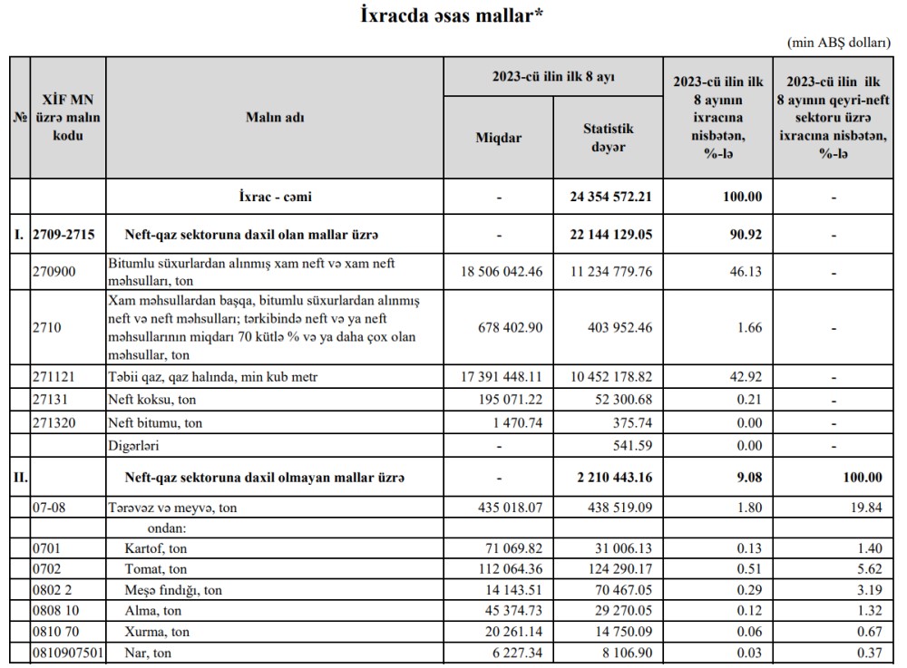 2023-cü ilin yanvar-avqust aylarında Azərbaycanın ən çox ixrac və idxal etdiyi mallar.