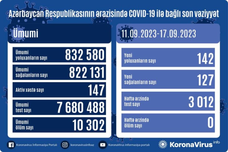Azərbaycanda indiyədək ümumilikdə 832 580 nəfər koronavirus infeksiyasına yoluxub. Onlardan 822 131 nəfər müalicə olunaraq sağalıb, 10 302 nəfər vəfat edib, aktiv xəstə sayı 147 nəfərdir.
