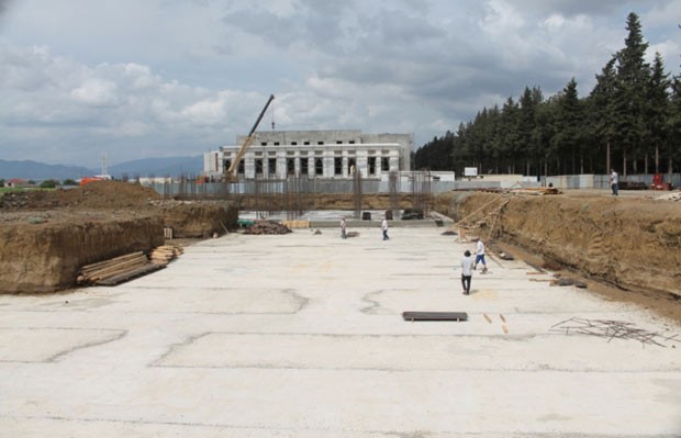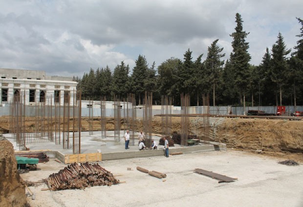 110 mənzilli yeni yaşayış kompleksinin tikintisində “SİRR M” MMC-nin inşaatçıları çalışırlar.