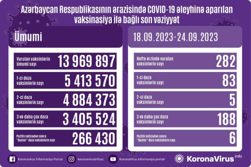 Ölkədə vurulan vaksinlərin ümumi sayı 13 969 897, birinci mərhələ üzrə vaksinasiya olunanların ümumi sayı 5 413 570, ikinci mərhələ üzrə vaksinasiya olunanların sayı 4 884 373, üç və daha çox doza vaksin vurduranların sayı 3 405 524, pozitiv nəticədən sonra buster doza üzrə vaksinasiya olunanların sayı isə 266 430 təşkil edir.