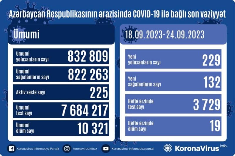 Azərbaycanda koronavirus (COVID-19) infeksiyasına son 1 həftədə (18-24 sentyabr) 229 yeni yoluxma faktı qeydə alınıb, 132 nəfər müalicə olunaraq sağalıb.