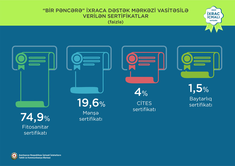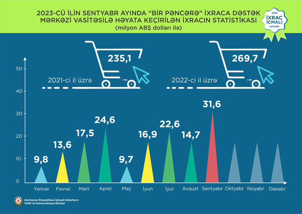 “İxrac icmalı”nda göstərilib ki, 2023-cü ilin sentyabr ayında “Bir Pəncərə” İxraca Dəstək Mərkəzi vasitəsilə həyata keçirilmiş qeyri-neft ixracının dəyəri 31,6 milyon ABŞ dolları olub.
