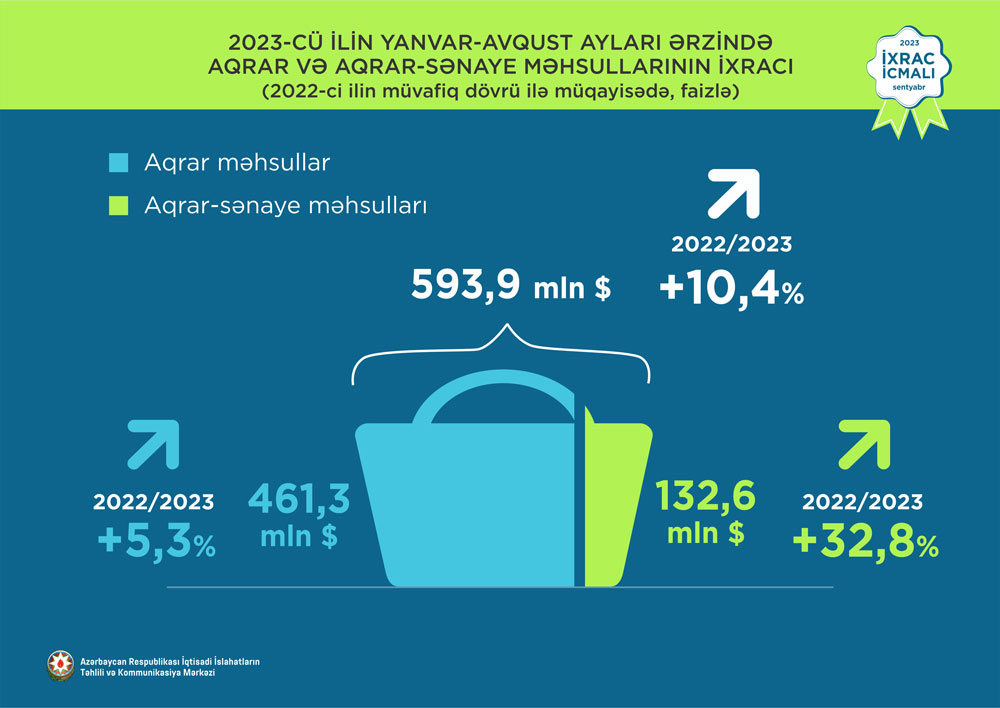 2023-cü ilin yanvar-avqust ayları ərzində aqrar və aqrar-sənaye məhsulları üzrə birgə ixracın statistik dəyəri 10,4% artaraq 593,9 milyon ABŞ dolları təşkil edib. Qeyri-neft/qaz ixracının tərkib hissəsində əhəmiyyətli yer tutan aqrar-sənaye məhsullarının yaratdığı dəyər ötən ilin müvafiq dövrü ilə müqayisədə 32,8% artaraq 132,6 milyon ABŞ dolları təşkil edib.
