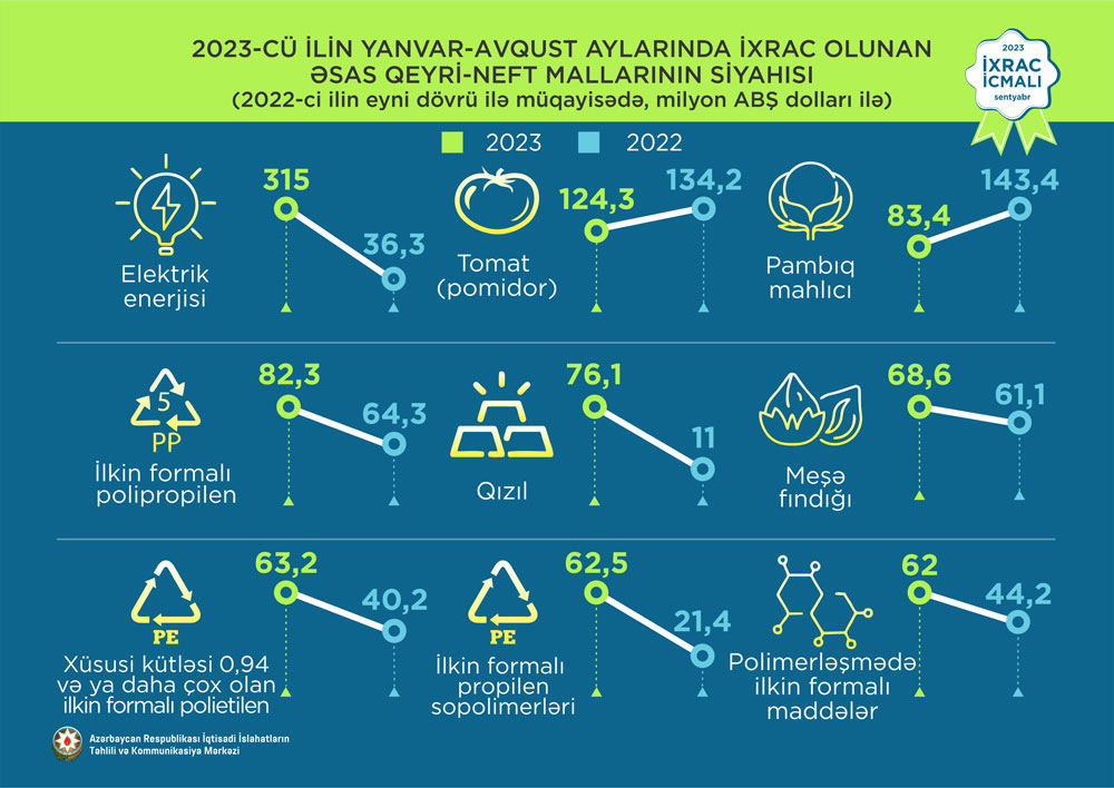 2023-cü ilin yanvar-avqust ayları ərzində ixrac edilən qeyri-neft sektoruna aid malların siyahısında elektrik enerjisi (315 milyon ABŞ dolları) birinci olub. Bu siyahıda pomidor (tomat) (124,3 milyon ABŞ dolları) ikinci, pambıq mahlıcı (83,4 milyon ABŞ dolları) isə üçüncü yerdə qərarlaşıb.