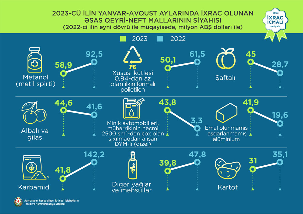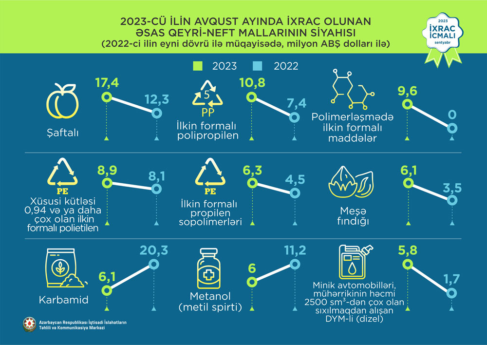 2023-cü ilin avqust ayında ixrac edilən qeyri-neft sektoruna aid malların siyahısında şaftalı (17,4 milyon ABŞ dolları) birinci, ilkin formalı polipropilen (10,8 milyon ABŞ dolları) ikinci və polimerləşmə nəticəsində əmələ gələn ilkin formalı digər maddələr (9,6 milyon ABŞ dolları) üçüncü olub.