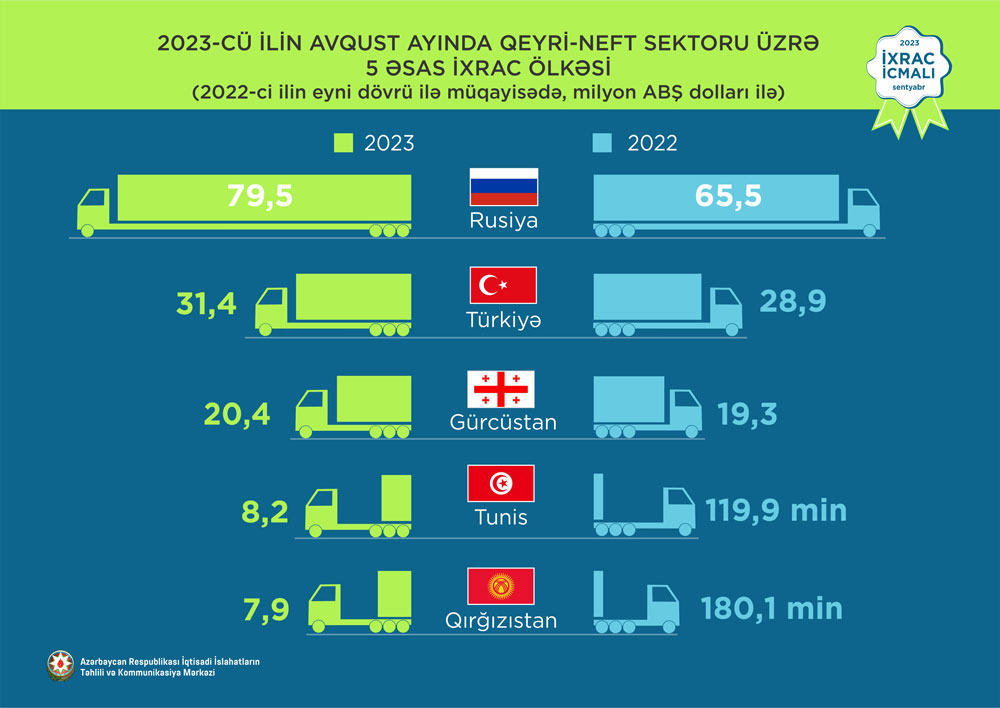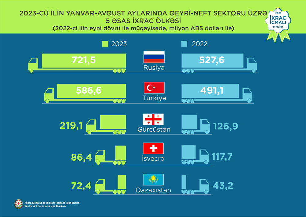 2023-cü ilin yanvar-avqust ayları ərzində Rusiya Federasiyasına 721,5 milyon ABŞ dolları, Türkiyəyə 586,6 milyon ABŞ dolları, Gürcüstana 219,1 milyon ABŞ dolları, İsveçrə Konfederasiyasına 86,4 milyon ABŞ dolları, Qazaxıstana isə 72,4 milyon ABŞ dolları dəyərində qeyri-neft sektoruna aid mal ixrac olunub.