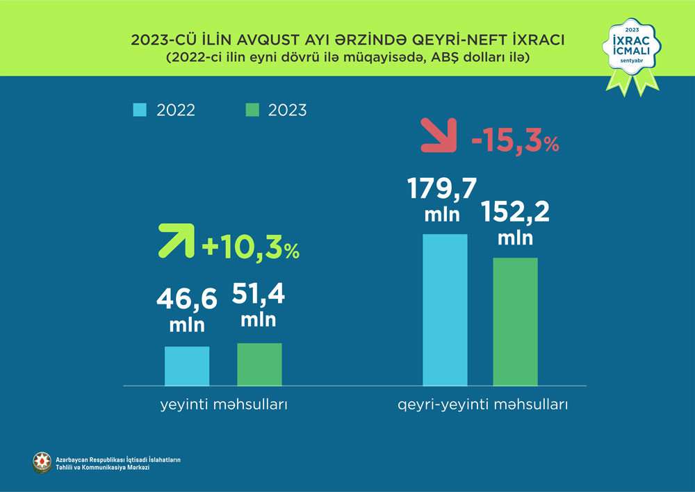 İcmala əsasən, 2023-cü ilin yanvar-avqust ayları ərzində Azərbaycanın ümumi ixracı 24,4 milyard ABŞ dolları, qeyri-neft sektoru üzrə ixrac isə 2022-ci ilin müvafiq dövrü ilə müqayisədə 14,6% artaraq 2,2 milyard ABŞ dolları təşkil edib. 2023-cü ilin yanvar-avqust ayları ərzində yeyinti məhsulları üzrə ixrac 571,4 milyon ABŞ dollarına bərabər olub.