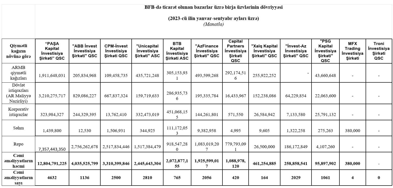 Bakı Fond Birjasında (BFB) ticarət olunan bazarlar üzrə 2023-cü ilin yanvar-sentyabr ayları üzrə birja üzvlərinin dövriyyəsi açıqlanıb.