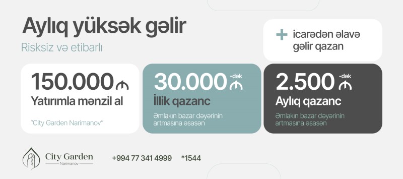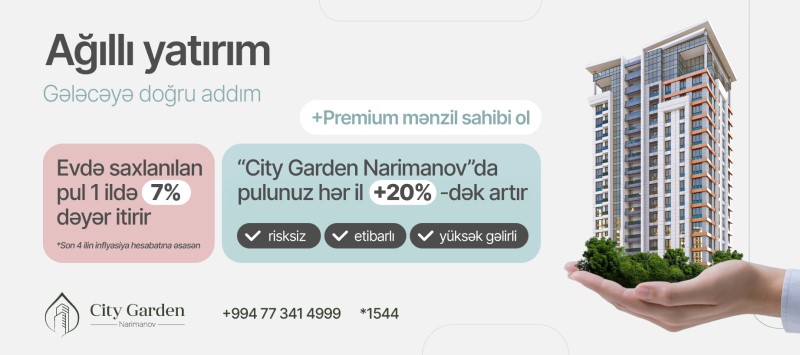 Hazırda 1-ci hissəsinin 80%-i inşa edilmiş meqa yaşayış kompleksi “City Garden Narimanov” layihəsi sizə illik 20%-dək qazanc gətirə bilən “Ağıllı Yatırım” imkanı təklif edir. Pulunuzu nə evdə saxlayın, nə də dəyərdən salacaq vasitələrə əl atın. “City Garden Narimanov”a investisiya edərək sərvətinizə dəyər qatın. Sadəcə 150 000 manatlıq yatırımla illik 30 000 AZN-dək gəlir əldə edin.