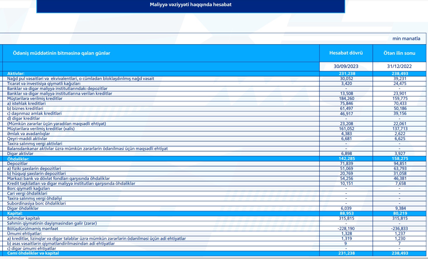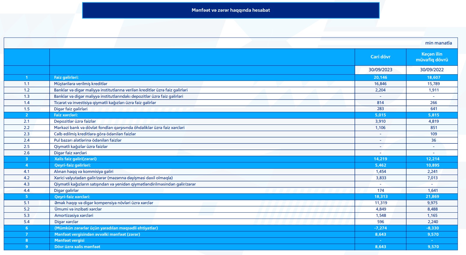 Bankın yaydığı məlumatda bildirilir ki, 30 sentyabr 2023-cü il tarixinə bankın aktivləri 231 milyon 238 min manat təşkil edib, bu da 2022-ci ilin eyni dövrü ilə müqayisədə 5,5% çoxdur. Bank hesabat dövrünü 8 milyon 643 min manat xalis mənfəətlə başa vurub.