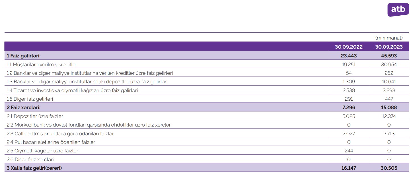 Bankın kredit portfeli və faiz gəlirləri də kəskin artıb."Azər-Türk Bank" ASC 2023-cü ilin 9 ayını (yanvar-sentyabr) 10 milyon 499 min manat xalis mənfəət ilə başa vurub. Bank ötən ilin 9 ayını 3 milyon 79 min manat xalis mənfəət ilə bağlamışdı. Beləliklə, "Azər-Türk Bank"ın xalis mənfəəti 2023-cü ilin 9 ayında ötən ilin eyni dövrü ilə müqayisədə 3,4 dəfə artıb. Xalis mənfəətin kəskin artması əsasən Bankın faiz gəlirlərinin artmasından qaynaqlanır.